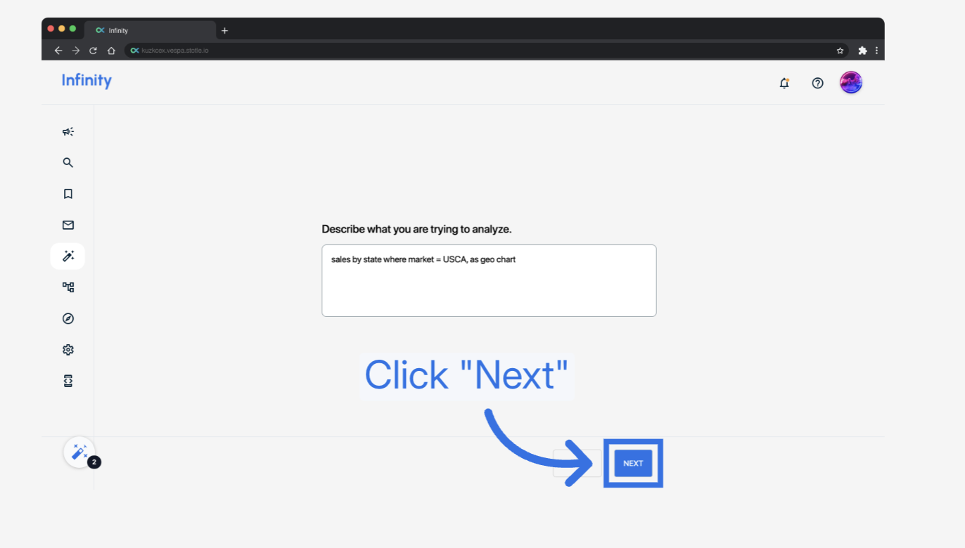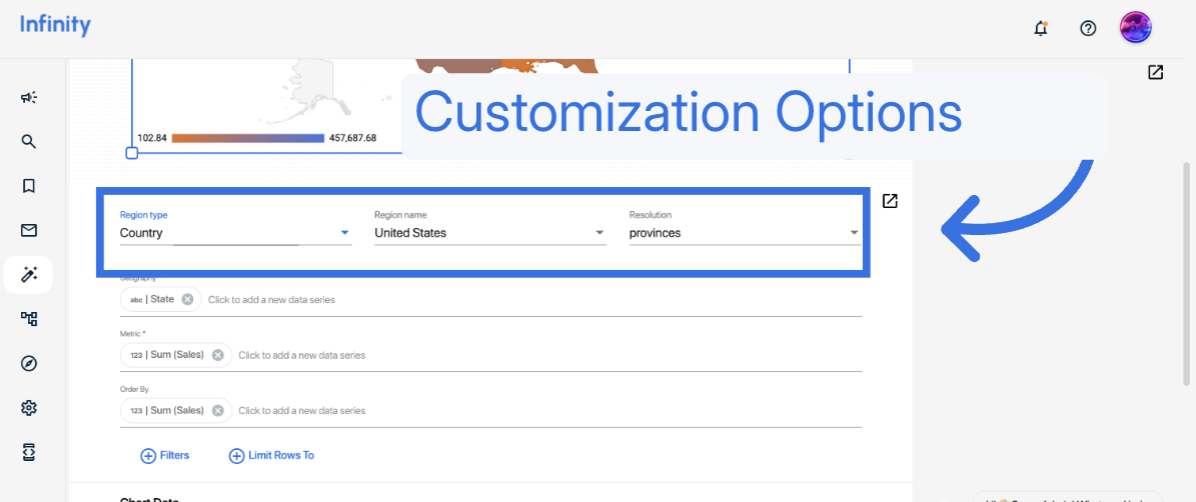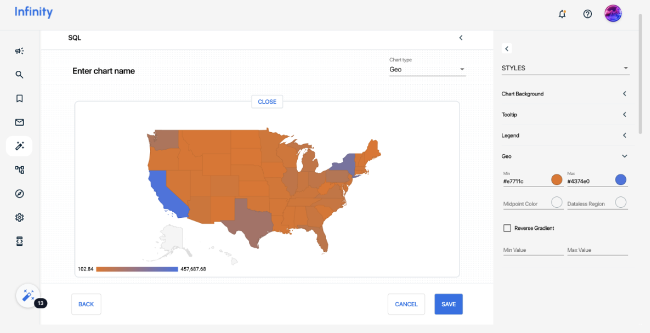 The Geo Chart in Infinity lets you visualize geographical data, such as sales by region, using a color-coded map. Follow the steps below to create and customize your own Geo Chart.